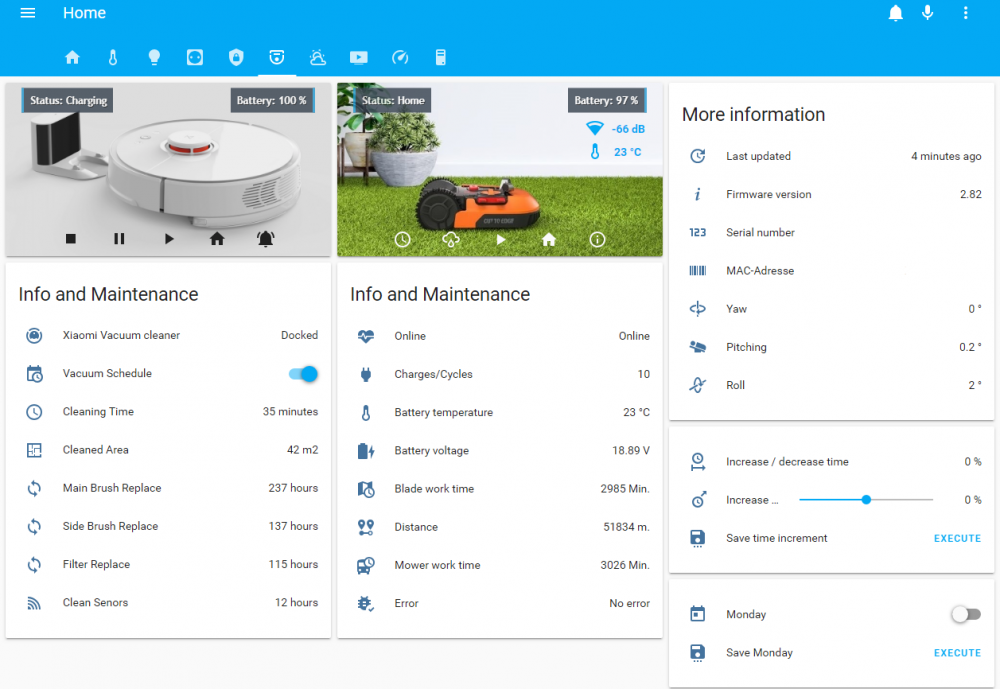 Har lagt inn robotklipperen (Worx Landroid S M700) og ordnet oppsett i lovelace lik det jeg har for støvsugeren. Mer info, forsinkelse ved regn og tidstyring kan vises/skjules ved behov. Er også sync så endringer man gjør enten i Home Assistant eller i mobil app er alltid i sync. Er basert på denne https://github.com/Barma-lej/halandroid og landroid bridge https://github.com/virtualzone/landroid-bridge Siden det ikke er en ferdig component for dette enda på Home Assistant. Kjører landroid bridge i docker. Bruker man Hassio er det litt lettere å sette opp siden det finnes en ferdig plugin.