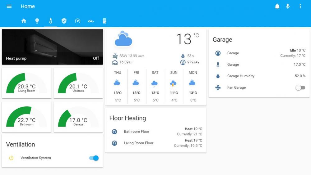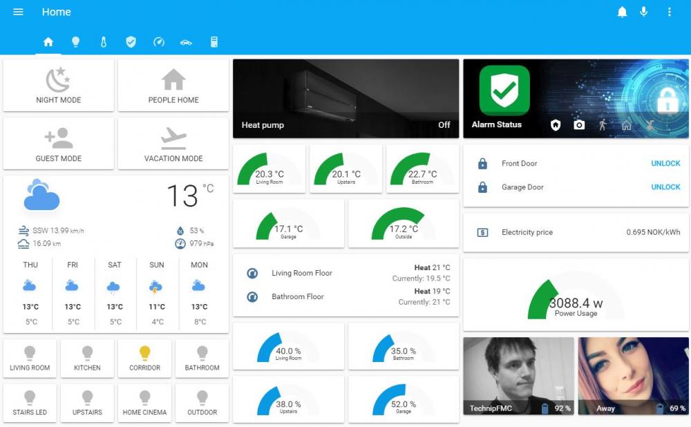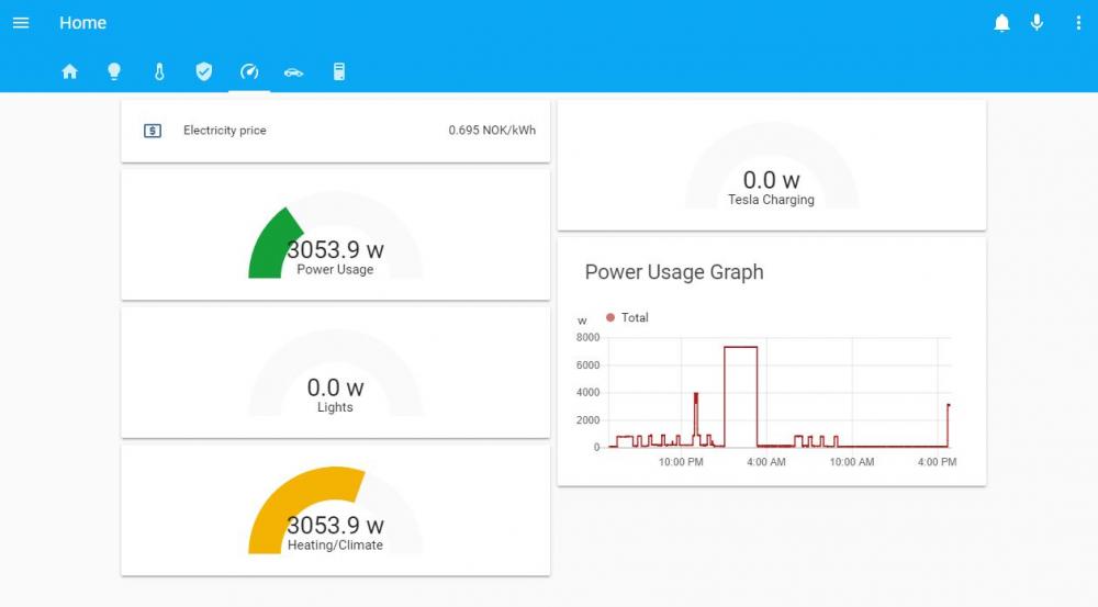 Noen oppdateringer Flyttet Home Assistant til en Synology Nas (916+) kjører i Docker. Stor forbedring fra Pi3+ som jeg brukte før. (En reboot av hass tar nå ca 5-7 sek) og mye raskere å hente opp logger, historiske data osv. Lagt til en noen nye enheter også som bla Heatit Ztherm2 for stue, kjøkken og spisestue så gulvvarme kan styres bedre. (Var bare effektregulatorer før som var veldig kjipt) Er også så å si ferdig med Lovelace oppsettet som brukes på tablet/mobil. Rask tilgang og oversikt til det som blir mest brukt Har også fått satt opp Google Assistant på Norsk mot Home Assistant. Fungerer bra men uvant å si Ok Google og ikke Alexa