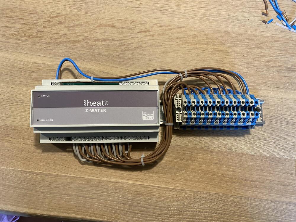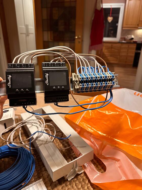Jeg vet ikke om jeg har NC eller NO, det er 230V aktulatorer kjøpt via BuildAHouse. Kobling til aktulator er forholdsvis enkel, den har 1 kurs som er fast strøm, koblet til de blå DIN klemmene på undersiden der (som de ikke er koblet noe), mens den brune/sorte kursen er koblet til de grå DIN klemmene. Litt som lys, at man har en fase som alltid er på og en annen fase som brytes via reléet.