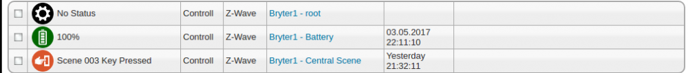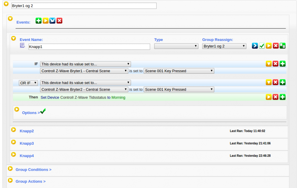 Nybegynner råd fra en nybegynner Hvordan jeg bruker ZRC-90. Dette vil sikkert bli banalt for de fleste her på forumet, men kan hjelpe ferskinger som har googlet seg hit. Mer erfarne folk er hjertelig velkomne med kommertarer og tips. Kommer sikkert flere slike poster etterhvert som jeg snubler meg igjennom hjemmeautomasjon. Kjøpte nylig 2 stk SCENE MASTER - ZRC-90. Mine første z-wave "brytere". Er helt fersk i hjemmeautomasjons gamet og viste (og vet) heller lite om hvordan en z-wave bryter virker. Hadde forventet at ZRC-90 skulle dukke opp som en hel masse device-er i Homeseer, men det gjorde den ikke. Plundret litt med dette og ingen av Google søkene mine ga meg svar på. Jeg vil bruke ZRC-90 for å slå ting av og på, og ble litt forvirret av alt snakket om z-wave scenes og scene oppsettet i Homeseer. Men her er hvordan jeg bruker ZRC-90. Følg bruksanvisningen og legg til ZRC-90 som en sekundær kontroller. Dvs include i Homeseer og trykk på "L" knappen på ZRC-90. Den legger seg til som en ny node, men uten knapper. Men dersom du trykker på en knapp og kikker på dine device-er i Homseer, ser at du følgende: Da er det enkelt å bruke dette i en event: https://www.tronika.no/en/zwave-controllers/972-scene-master-zrc-90.html?search_query=controller&results=130