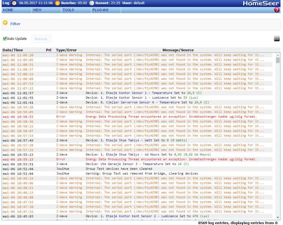 Da har dette problemet forsvunnet på magiskt vis. Jeg kopierer inn min post fra Homeseer forumet da jeg er litt lat: Update: Was backing up my Homeseer files to test your suggestion. Was just checking the log to make sure I still had the issue, and lo and behold, no more (/dev/ttyACM0) entries! I have no real explanation for it, but I have been doing a alot of server restarts today experimenting with Homeseer autostart and Windows language settings. Guess Homeseer fixed itself somehow? Anyway, thank you for the inputs. Going to dig through the logs a bit and see if I can find some more definitive answers. Will post again if I find anything worth while -