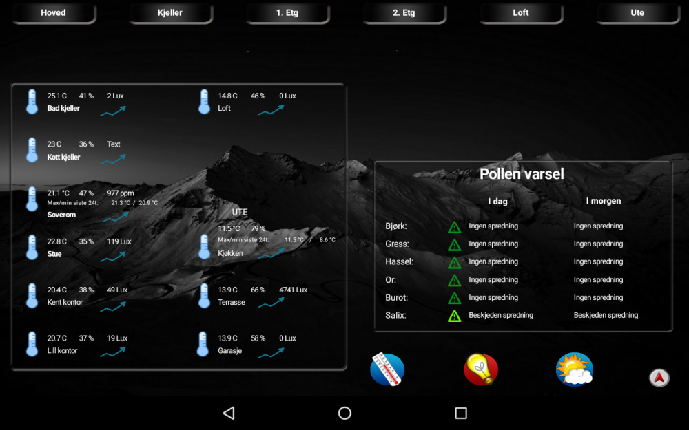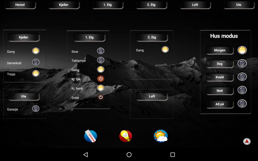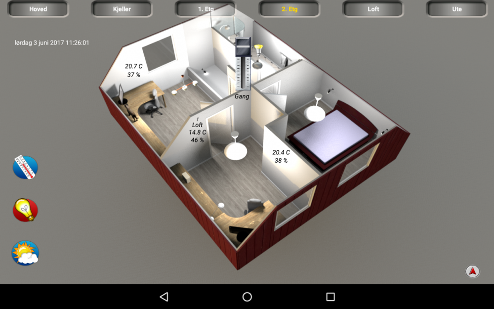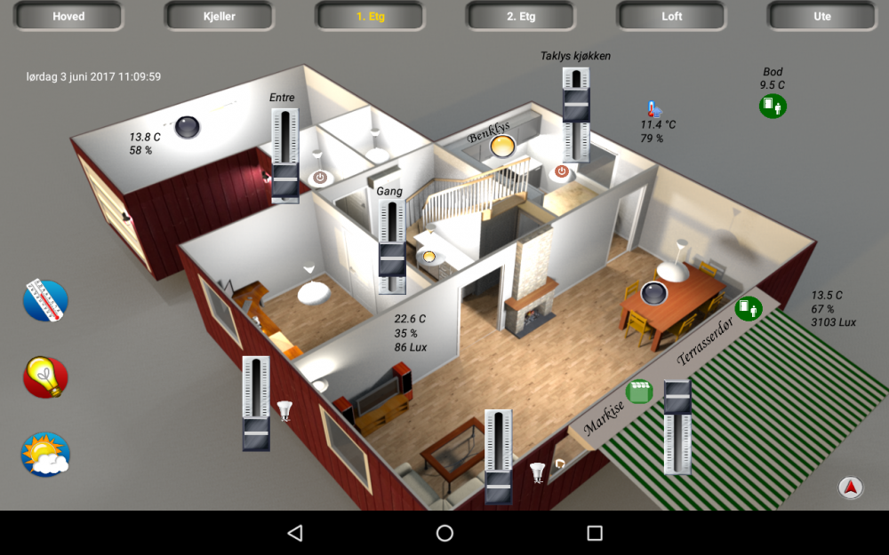 Deler her hvordan mitt oppsett med Homeseer og HStouch. Som en fersk automatiserer, ville jeg bare ha opp noe grafisk visning raskt og enkelt, som jeg kunne jobbe videre med etterhvert. Det viser seg at det er nesten like moro å fikle med HStouch, som å jobbe med Homeseer. Synes ikke HStouch er verdens beste designer program akkurat, men det duger. Dette er noe som funker for oss, men som kommer til endre seg etterhvert. Klarer ikke å bestemme meg for om jeg skal bruke et lyst eller mørkt tema. Hvor mye custom knapper og grafikk det blir vet jeg ikke. Det er en del jobb å lage egen grafikk, og det jeg har forsøkt å lage selv ser ikke ut . Ble inspirert av andre som brukte plantegninger til å vise/styre komponenter. Ikke særlig originalt men jeg liker det. I tillegg enkle screens med klimadata, lås/åpne/lukke funksjoner mm. Sweet Home 3D (gratis) for plantegninger Lenovo Yoga tab 3 som infoskjerm Plug-Ins: Device History JowiHue UltraNetatmo3