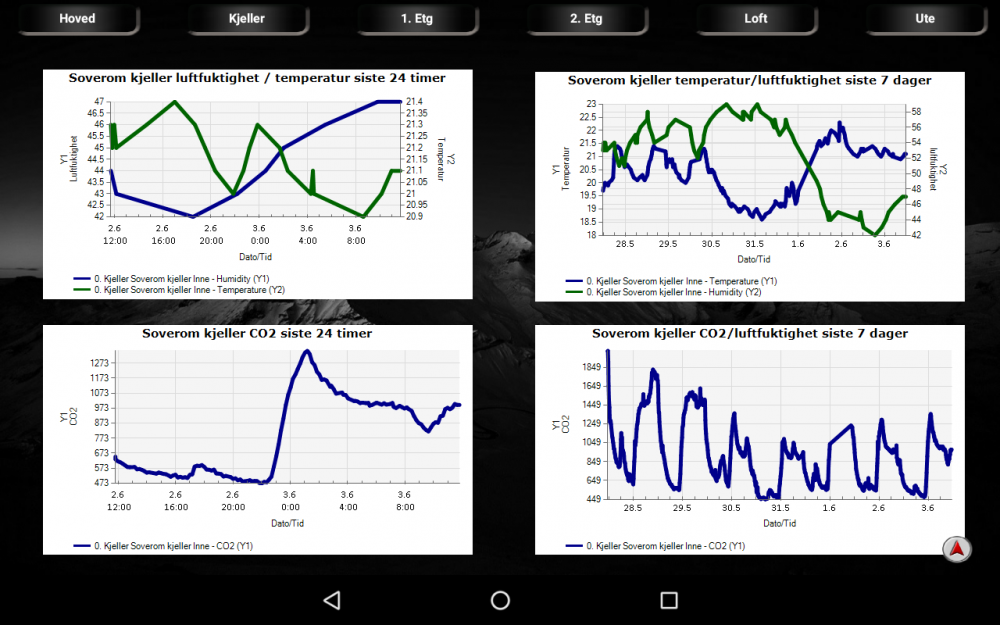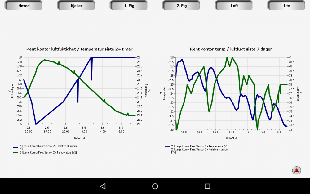 Da er jeg blitt litt klokere på dette. Det er pipe tegnet <|> som virker fint i et script, men tuller til det i HStouch når det legges inn i et tekst objekt og "isHTML" er "true". Antar at det er HTML som ikke tolker pipe riktig. Har forsøkt å bare erstatte pipe symbolet med HTML koden for pipe, men uten hell. Jeg får belage meg på å scripte grafene med mange Y1 eller Y2 linjer på, og hente de inn i HStouch som et bilde. Script som virker i Homeseer/script &nhs.PluginFunction("Device History", "", "CreateChartEx", {"124","{'Title': 'BAD temp/fukt', 'Y1Label': 'Temp', 'Y2Label': 'Fukt','XLabel': 'Date/Time', 'ShowLegend': true, 'DurationType': 2, 'PeriodType': '2', 'Periods': '3', 'Style': 1, 'UseMarkers': false, 'Width': 640, 'Height': 480, 'TransparentBG': false, 'ImageBGColor': 'White', 'AxisLineColor': 'DimGray', 'TickMarkColor': 'DimGray', 'GridCLineColor': 'gray', 'LineWidth': 2}", "42|35", "126"} Men som ikke virker når det skal brukes i HStouch pga pipe: <img src='http://10.0.0.22/[$SCRIPT=&nhs.PluginFunction("Device History", "", "CreateChartEx", {"124","{'Title': 'BAD temp/fukt', 'Y1Label': 'Temp', 'Y2Label': 'Fukt','XLabel': 'Date/Time', 'ShowLegend': true, 'DurationType': 2, 'PeriodType': '2', 'Periods': '3', 'Style': 1, 'UseMarkers': false, 'Width': 640, 'Height': 480, 'TransparentBG': false, 'ImageBGColor': 'White', 'AxisLineColor': 'DimGray', 'TickMarkColor': 'DimGray', 'GridCLineColor': 'gray', 'LineWidth': 2}", "42|35", "126"})]' /> Her er grafen som blir laget av scriptet: