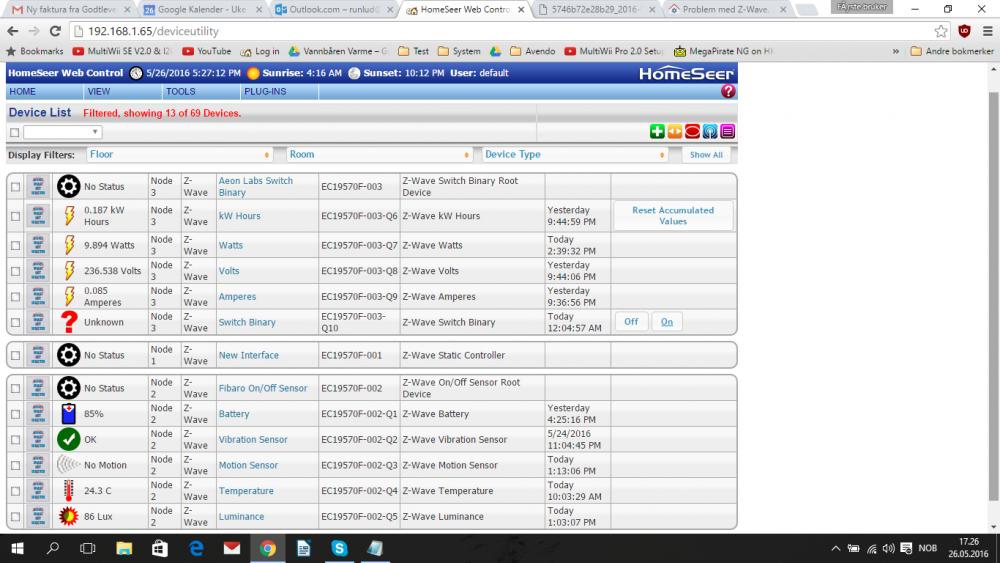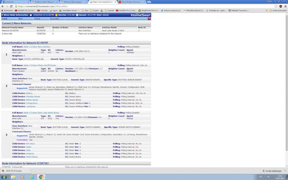 Nå har jeg slettet 7261 (under HomeID) og fjernet poll . Restartet systemet, Men det fungerer fortsatt ikke....... :-( Z-Wave Node Information 5/26/2016 8:38:26 PM Sunrise: 4:16 AM Sunset: 10:12 PM User: default HOME VIEW TOOLS PLUG-INS Current Z-Wave Networks Network Friendly Name HomeID Number of Nodes Interface Name Interface Model Node ID Network EC19570F EC19570F 3 New Interface Aeon Labs Aeotec Z-Stick 1 Node Information for Network EC19570F 1 Full Name: Node 1 Z-Wave New Interface Polling: Polling Disabled Manufacturer: Aeon Labs Type: 0x0 ID: 0x0 Listens: Yes Version: 3.95 (ZDK 6.51.2) Neighbor Count: 1 Speed: 100Kbps Neighbors: 3 Basic Type: STATIC CONTROLLER, Generic Type: STATIC CONTROLLER 2 Full Name: Node 2 Z-Wave Fibaro On/Off Sensor Polling: Polling Disabled Manufacturer: Fibaro System Type: 0x800 ID: 0x1001 Listens: No Version: 3.67 (ZDK 4.55) Firmware: 2.7Hardware: 1 Neighbor Count: 0 Speed: 40Kbps Neighbors: Uses Interface: New Interface (1) Basic Type: ROUTING SLAVE, Generic Type: SENSOR BINARY, Specific Type: ROUTING SENSOR BINARY Command Classes: Supported: Sensor Binary(V 1), Wake Up, Association, Battery(V 1), Multi Cmd, Crc 16 Encap, Manufacturer Specific, Version, Configuration, Multi Instance Association, Sensor Multilevel(V 5), Sensor Alarm(V 1) Child Device: Battery CC: Battery Polling: Polling Interval: 23h, 0m, 0s Child Device: Vibration Sensor CC: Sensor Alarm Polling: Polling Disabled Child Device: Motion Sensor CC: Sensor Binary Polling: Polling Disabled Child Device: Temperature CC: Sensor Multilevel Ver: 5 Polling: Polling Disabled Child Device: Luminance CC: Sensor Multilevel Ver: 5 Polling: Polling Disabled 3 Full Name: Node 3 Z-Wave Aeon Labs Switch Binary Polling: Polling Disabled Manufacturer: Aeon Labs Type: 0x3 ID: 0x12 Listens: Yes Version: 3.4 (ZDK 4.54) Firmware: 3.0 Neighbor Count: 0 Speed: 40Kbps Neighbors: Uses Interface: New Interface (1) Basic Type: ROUTING SLAVE, Generic Type: SWITCH BINARY, Specific Type: POWER SWITCH BINARY Command Classes: Supported: Switch Binary(V 1), Meter(V 3), Switch All, Scene Actuator Conf, Scene Activation, Configuration, Association, Crc 16 Encap, Manufacturer Specific, Version Controlled: Hail Child Device: kW Hours CC: Meter Ver: 3 Polling: Polling Disabled Child Device: Watts CC: Meter Ver: 3 Polling: Polling Interval: 5m, 0s Child Device: Volts CC: Meter Ver: 3 Polling: Polling Disabled Child Device: Amperes CC: Meter Ver: 3 Polling: Polling Disabled Child Device: Switch Binary CC: Switch Binary Polling: Polling Disabled Home | Device Status | Device Management | Events | Log | Setup | Global Elements | Control Panel | Manage Plug-ins | About
