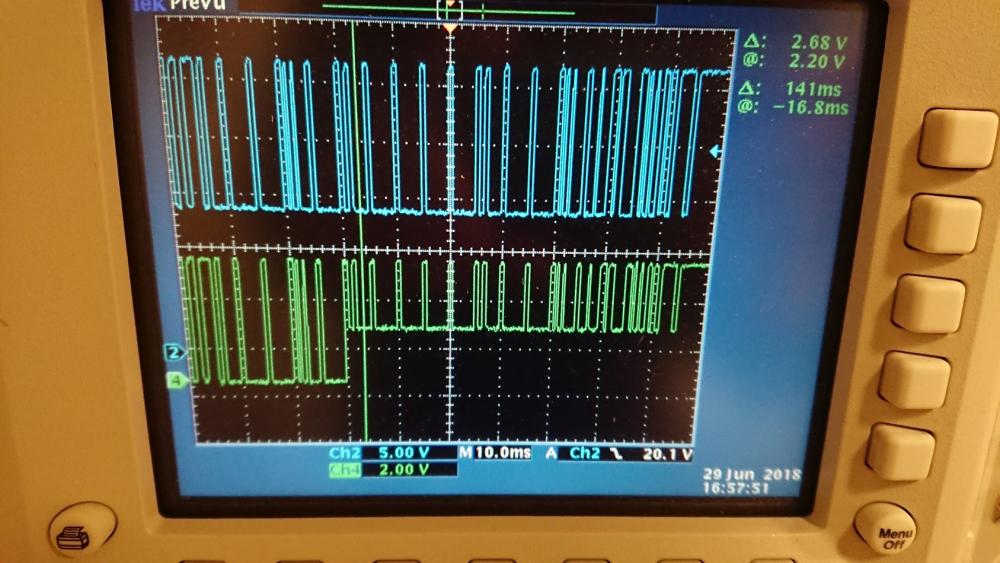 3. Jeg har kikket litt på denne disse trådene for lesing av HAN. Jeg har endt opp med å bruke en ferdig M-Bus til TTL modul fra aliexpress koblet til en ESP-8266 ESP-01 versjonen med RoarFred sin Arduino kode: https://www.aliexpress.com/item/TSS721-Module-Board-M-BUS-To-TTL-with-RX-TX-Indicator-STM32-Development-Board-Free-Shipping/32751482255.html Dette fungerer feldig fint på det korte meldingene med kun Power(W) sendingene fra HAN koblingen, men når de lengre meldingene med strøm/spenning så feiler 1/3 av meldingene av å bli lest av ESP modulen. Jeg har aldri fått lest kWh meldingene fra HAN koblingen. Etter å ha sjekket litt med oscilloscope så fikk jeg se dette som er på bildet: Her ser vi øverst signalet direkte på HAN koblingen (M-Bus). Nederst TTL singalet ut fra M-bus til TTL konverteren. Her ser det ut som at konverteren ikke klarer å lage TTL signalet mot slutten av meldingen. Mot slutten så halveres spenningen på signalet fra 5V til ca 2.2v. Dette er litt for lavt for at ESP modulen detekterer signalet. Er det noen der ute som kan gi meg noen tips på hva jeg kan sjekke for å få konverteren til å fungere ordentlig?