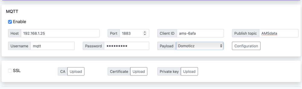 4. Hei, Etter å ha trykket en del timer har eg fått satt opp en PI med Domoticz og mosquitto som Broker. Kommunikasjonen her ser ut til å være på plass. Videre har eg gått til innkjøp av en AMS leser fra AMSleser.no. Denne er satt opp for MQTT. Eg har prøvd en rekke varianter for å sette den opp for MQTT, men får bare feilmeldingen "MQTT failed to Connect". Det er helt sikkert noe eg gjør feil. Er det noen som kan hjelpe meg litt på veien.