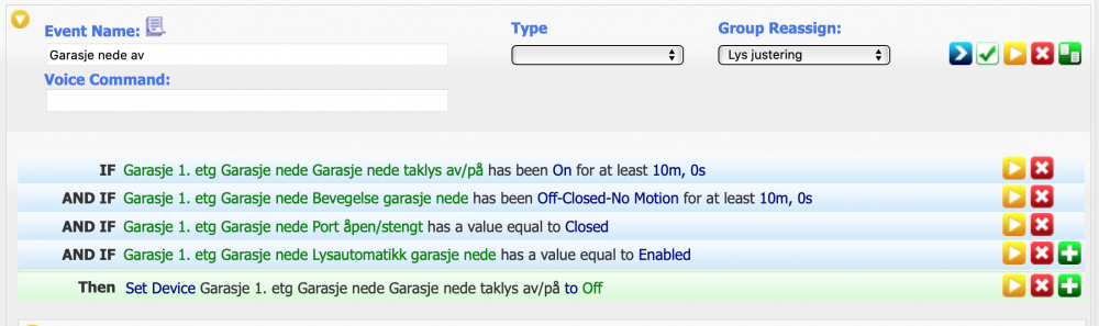 Jeg har endret mine eventer som benytter tid, men de fungerer ikke. Noen som kan si meg hva som er feil med denne? Lyset har sluttet å slå seg av. Men jeg kan fint slå det av manuelt. Tanken min er at lyset skal av etter 15 minutter, hvis det ikke har vært bevegelse i rommet på 14 minutter. Har også en virtuell bryter, som jeg skrur av/på om jeg skal være lenge i garasjen og ikke vil risikere at alt blir mørkt. Har også lagt inn 30 sekunder på cannot re-run for å ikke overbelaste hvis det blir noe krøll 🙂