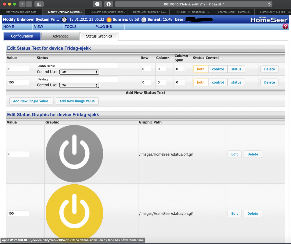 Åpen for alle gode løsninger Dette fungerer jo utmerket. Virtuel device: Fant bilde av "enabled" og "disabled" her: images/HomeSeer/ui/I-On.gif
