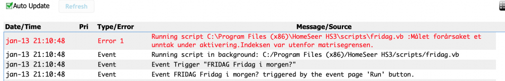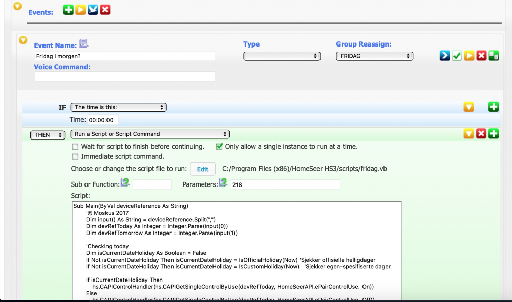 Da forsøker vi fridager.vb først Tatt screenshot av log, event, virtuel enhet og status-graphics. Script er kopiert (og ikke redigert) direkte fra innlegget med fridager, og scriptet for to device her takk for hjelp
