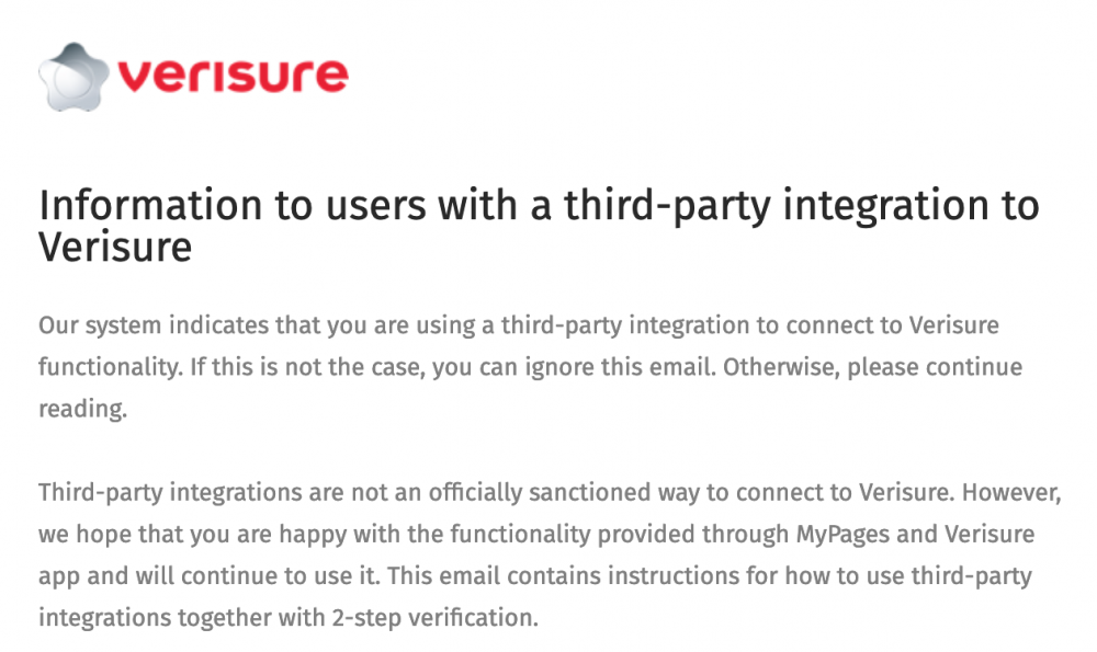 Fikk i går mail fra Verisure at de ser jeg bruker 3. parts app/tilkobling MEN, det var en mail av det positive slaget. De informerte om at 2-faktor aut. måtte slås av for å få 3. part til å fungere. Når jeg skulle slå av kom det en spørreundersøkelse, og passet på å skrive ønsket om åpent API Nå er det lenge til jul, men rarere ting har skjedd, så lov å håpe.