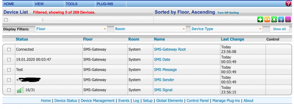 Automatisert UPS med SMS-varsel. Endelig klart å koble en USB kabel inn i den ?? Kjøpte for en tid tilbake en Bluewalker 850 UPS, tilsvarende denne, men uten display: https://www.komplett.no/product/893764/datautstyr/pc-tilbehoer/ups-overspenningsvern/ups-og-ups-batteri/bluewalker-pw-ups-vi-850-shl (Fantastisk pris på den der nå.) Den rapporterer at min i5 Dell SFF pc som kun benyttes til HS drar ca 16%, og at den vil holde drift på batteri i ca 30 minutter. Software fra produsent sender shut-down signal når det er 2 minutter igjen. (Justerbart) I HS installerte jeg BLUPS plugin, som gir meg noen devices Så sender SMS-Gateway en SMS ved strømbrudd og også en når strømmen er tilbake.