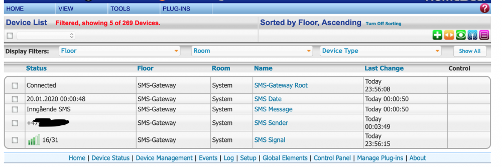 Ja, får både sendt og tatt i mot Første bilde er hvordan det ser ut når jeg lagde en manuel event, for å sende en sms til meg. Teksten "test" her kommer fra event-overskriften. Slik ser det ut når jeg sender en sms tilbake: Her kommer selve teksten jeg sender inn i status. Jeg skrev "Inngående SMS" Det står +47 i status, men i event så skriver jeg nummeret uten. Har forsøkt å få en event til å kjøre ved mottak av en spesifikt melding, men så langt får jeg til å sende en pushover (i mitt tilfelle) uansett hva jeg sender inn som sms. Gode tips tas i mot med takk. Tenker også at den bør sjekke avsender-nummer også.