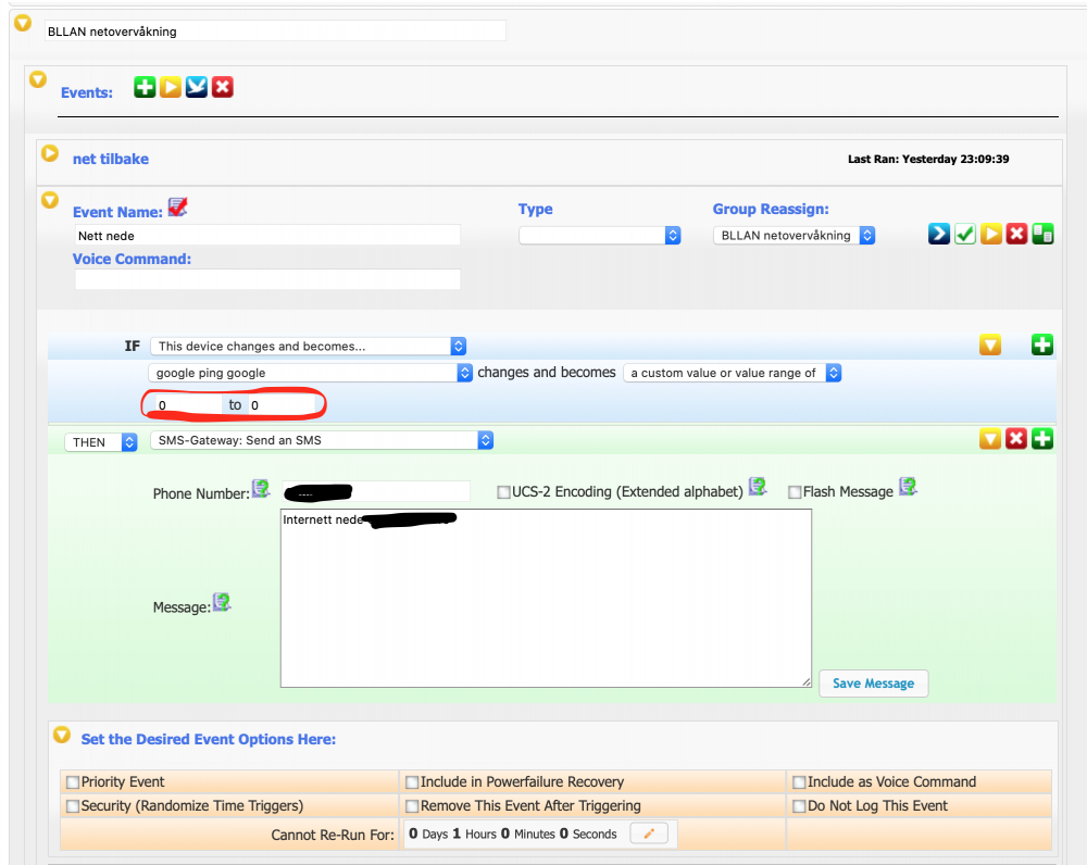 Overvåke om HomeSeer er tilkoblet internett. Kom på tanken da Telenor sendte meg sms om at nett og TV var nede på min adresse, men når jeg sjekket så var "huset" fortsatt på nett Så da er det bedre å overvåke slikt selv. Litt søking, og kom til slutt tilbake til HomeSeer ? BLLan plugin, gratis, kan overvåke datamaskiner og nettadresser. Så la inn en ping mot google.no, og en event som sender meg SMS ved manglende svar etter X forsøk over X sekunder. Dette gir meg et par linjer i HS, og to devices. Dette kan så brukes i et event, som varsler. Telefonnummer skrives rett frem, uten noe prefix. Value 0 = nett nede. Value 100 = nett oppe/ping svar. SMS sendes via et 4G modem, som jeg har skrevet om tidligere, i forbindelse med overvåkning av strømmen, via BLUPS plugin og SMS varsling. Etter det innlegget, fant jeg svaret på å ikke bruke nett, det var å slå av TCP/IP 4 og 6 på den i windows