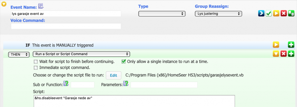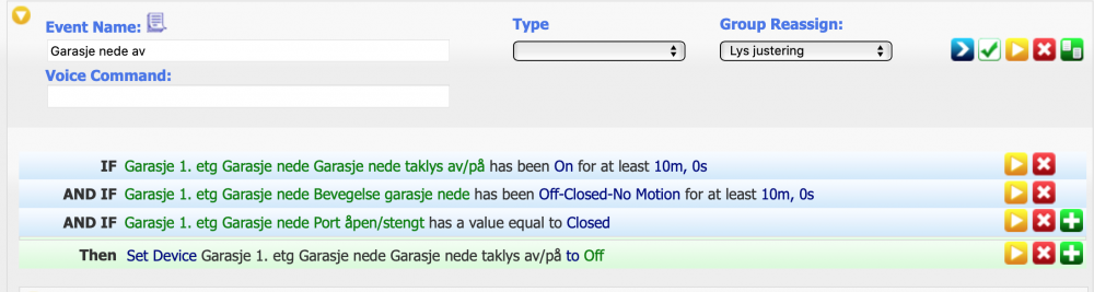 Hei, I garasjen har jeg magnetsensor på port, dør samt en bevegelsessensor. Her har jeg et velfungerende event, som slår av taklys når ingenting har skjedd på sensorene. Problemer er at den ikke "ser" meg under bilen, hvis jeg holder på der Tenkte å lage noen "knapper" i HSTouch og eventuelt en "Fibaro buttons" plassert i garasjen, som slår av eventen. Forsøkt meg med en event, som jeg da kan starte, som slår av auto-av på lyset. Her stoppet script-kunnskapen min. Trodde jeg kunne legge inn: &hs.disableevent "Garasjel lys av" Men det fungerte ikke.. Ønsker samtidig å se om eventen "Garasje nede av" er aktiv eller ikke i HSTouch. Er det mulig?