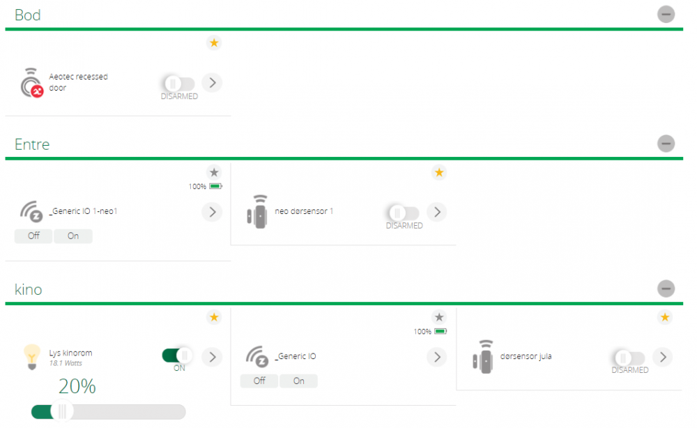 Takk for inspill. Har slettet den og lagt inn på nytt, men den kommer fortsatt frem som 2 enheter, og sletter jeg en av de, forsvinner begge... så kanskje en liten mail til Vera også er på sin plass Jeg har slettet scener osv, så nå når den ikke er armert, får jeg kun 1 beskjed for hver endring av status, altså åpnes eller lukkes. Med bryteren for arm på, så kommer det flere. Litt mer forståelig nå i alle fall. Hvis det nå var mulig å få Doorman til å sende en kommando til kontrolleren for å velge mellom hjemme eller borte, så er vi på god vei til et både barnevennlig og konevennlig system En annen liten ting som jeg ikke har er push-varslig fra app på telefon. Alle tillatelser er riktig i instillingene på telefon, men med mindre jeg er inne i appen kommer det ingen varslinger.. vel, mail og 2 sms pr dag kommer, men selve Vera-appen sender ingen push.. (iOS)