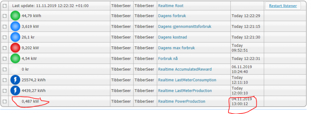 MEN.. når jeg nå sjekket litt mer, så kan det se ut som at det sluttet å fungere etter at jeg la til solcelle inverteren i Tibber! Den ble lagt inn mellom 19:00 og 19:15. Og ingenting har oppdatert seg etter 19:15. Så kan vel tyde på at det er noe som har skjedd hos Tibber da. Edit: Pratet med Tibber og de skulle se på saken.