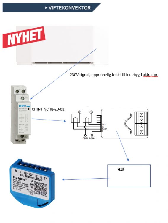 2. Snakket med elektriker og han stakk innom idag for å sjekke. Var kanskje litt varmere enn vanlig, men han hadde med ny og byttet når han først var her. Fikk samtidig målt litt, og alt fungerer som det skal fra viftekonvektor og til Relè. Relè er Normally Open, så når viftekonvektor sender signal, så stenger relè og kobler sammen jord+IN1 på Smart Implant. Så hvorfor jeg ikke klarer å få rett avlesning i HS3 når jeg programmerer den som en monostable switch på IN1, det skjønner jeg ikke.