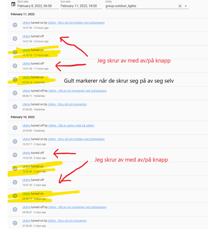 Jeg prøver å debugge hva i alle dager som går galt her. Ser på historikken til lys-gruppen og individ-lysene, men jeg får ingen informasjon om hva det er som slår lysene på...