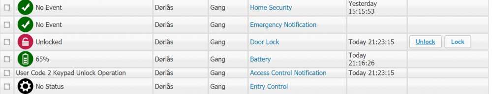 Men når jeg ser på oversikten har det ikke vært noen endring i door lock siste 2 døgn. Skal den da trigge på batterinivå avlesning? Eller leser den inn alle verdier, men ingen endringer og dermed ser det ut som ingen endringer i loggen, men i praksis er det en endring til samme parameter?