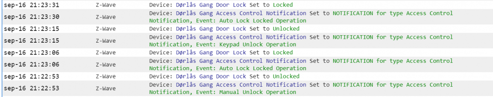 Ok, da har jeg kjørt et par tester. Ser ut som låsen rapporterer riktig når man låser, men ikke når den låses opp. Her låses det fra HS Her låses det opp fra HS Her er utdrag fra z-wave 1.6 manualen som viser til endringer.