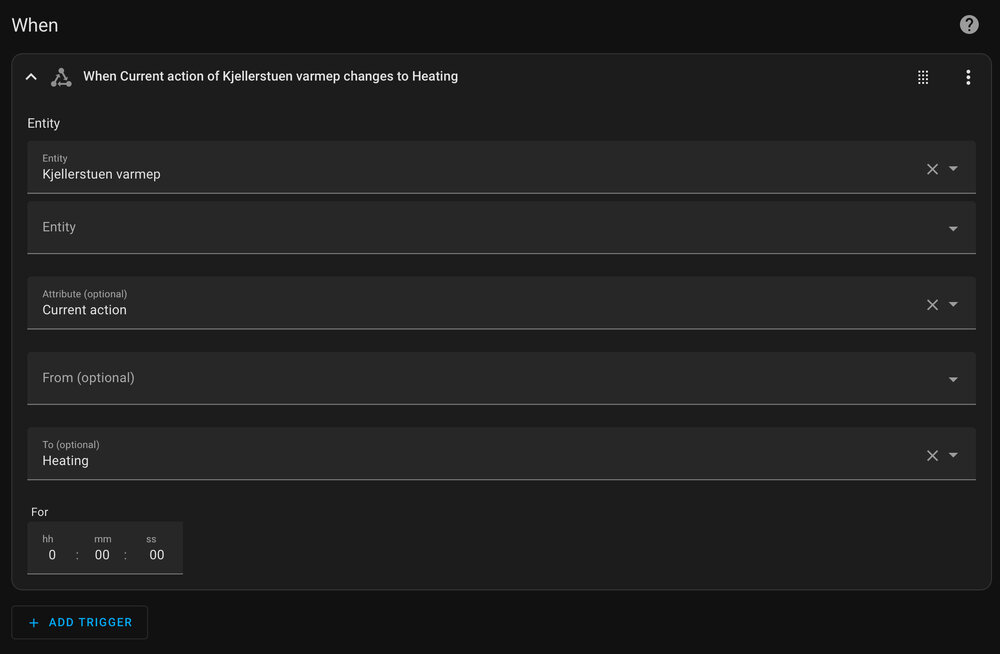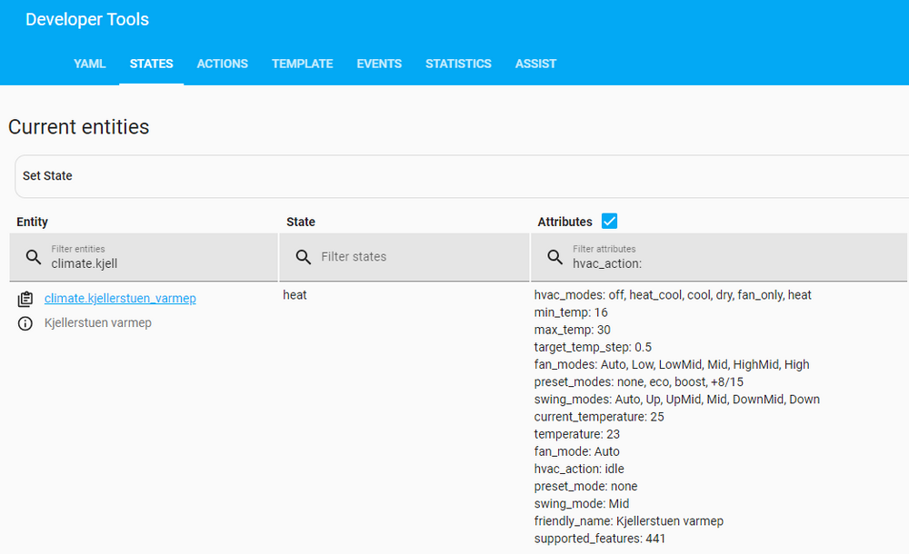 Dette ligger ikke lett tilgjengelig, men jeg fant nylig metoden i Home Assistant og deler gjerne denne kunnskapen 🙂 : Gå til Developer Tools og STATES. Bruk filter funksjonen og vis kun den aktuelle climate enheten. Noter ned navnet på aktuell Atribute. Fortsatt i Developer Tools, bytt til TEMPLATE og skriv inn dette i Template editor (rediger slik at du bruker egne verdier): {{ state_attr('climate.kjellerstuen_varmep', 'hvac_action') }} Da vil du umiddelbart se om du har truffet og får vist den verdien som er korrekt, du kan også teste ved å f.eks. endre temperaturmål på klimaenheten slik at den endrer modus. Denne endringen skal vises i Result feltet. Template teksten kan brukes til å lage en sensor som er litt enklere å bruke i en automasjon, se eksempel lenger ned. Jeg har dette i min sensors.yaml fil (kan også ligge i configuration.yaml). Den første hadde jeg fra før, jeg bruker den til å detektere når måltemperaturen på varmepumpen endres til en lavere temperatur enn normalt. Dette skjer når jeg har aktivert Borte-modus i Tibber appen (jeg lar Tibber styre varmpepumpen). Den informasjonen bruker jeg som til å sette en global hjelper fra normal til borte - og den status igjen brukes til å sette andre enheter (gulvvarme, panelovern, ventilasjon og vv-bereder) i borte modus. Borte modus i Tibber appen legges inn med en varighet, og Tibber starter oppvarmingen igjen i passende tid (og gjerne når strømprisen er lav), slik at det er behagelig temperatur når vi kommer hjem igjen. Økt temperaturmål brukes igjen som trigger for en automasjon som skrur andre enheter i huset tilbake til normal modus. Dette gjør at jeg kun trenger å endre modus et sted - i Tibber appen. Jeg kan få HA til å følge den, men å få HA til å styre Tibber er så langt ikke mulig. - platform: template sensors: varmepumpe_kjeller_maaltemp: friendly_name: "Varmepumpe kjellerstue temperaturmål" unique_id: varmpepumpe_kjeller_maaltemp unit_of_measurement: 'degrees' value_template: "{{ state_attr('climate.kjellerstuen_varmep', 'temperature') }}" - platform: template sensors: varmepumpe_kjeller_modus: friendly_name: "Varmepumpe kjellerstue aktiv modus" unique_id: varmpepumpe_kjeller_hvac_modus value_template: "{{ state_attr('climate.kjellerstuen_varmep', 'hvac_action') }}"