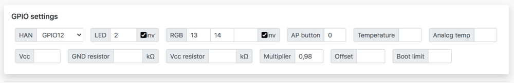 2. Supert. Da kom vi videre ett trinn 😃 Jeg valgte da GPIO 12 for HAN porten, og får opp strøm. Jeg valgte tallet 5 på temperature, det fungerte ikke selv om jeg mener jeg brukt GPIO5. Så jeg prøvde 4, 3, 2, og fikk ikke noen temperatur på noen av disse. Da valgte jeg tallet 6 og så krasjet hele tinga og nå får jeg ikke kontakt med den lengre 😃 . Det er ikke mulig å kontakte på local adressa, eller på IP addressa. Og den har nå dettit ut fra IP register i routern. Den meler seg ikke på. Fortsatt så gir den blå blinkelys og konstant grønn lys. Jeg har tatt den ut av måleren i ca 10-15 minutter, og prøvd såvel reset som AP knappene. Ikke noen resultat. Den er vekk fra nettet og kommer ikke tilbake som AP. Den er tilkoblet Micro USB for strømforsyning. Har jeg gjort noe galt igjen? //GF