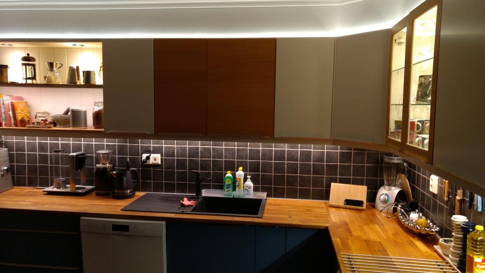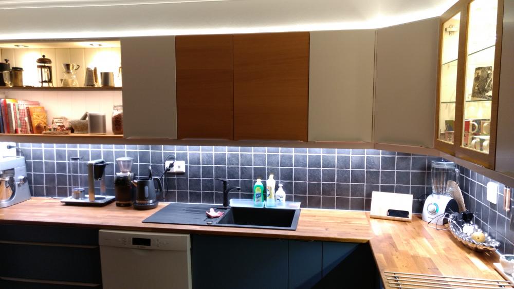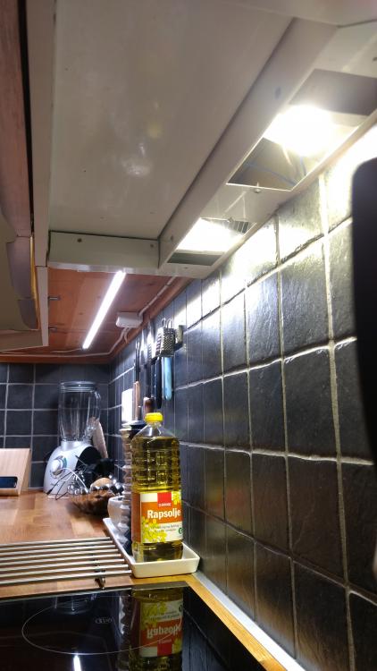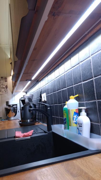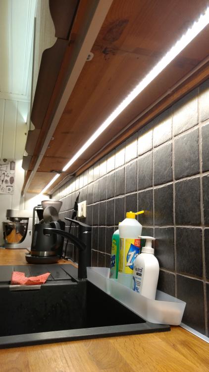 Her ser dere litt bilder av hybridstripa til Yuji-led i aksjon. Noen bilder med bare 2700k diodene og noen med både 2700k og 5000k diodene. Stripa er montert i aluminiumskanaler som henger i klips skrudd fast under skapene. Da kommer det luft mellom kanal og skap og det gir enda bedre kjøling. I flexit-ventilatoren satt det 2 stk E27-pærer, disse har jeg byttet ut med 2x 8W Cob-led fra ebay montert på kjøleribber. Disse gir sykt mye lys, men jeg tenker å bytte dem ut med noe cree-greier med høyere cri. Her skimtes elkobryteren jeg bytter mellom fargetemp med. Ganske primitivt i denne kretsen.
