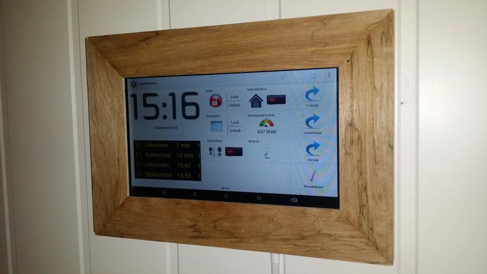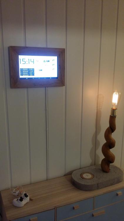 I dag har jeg fått laget til en ramme og installert min første vegghengte tablet med imperihome. Måtte borre et lite hull til frontkamera så devicen vekkes ved bevegelse. Ble ganske stilig og veldig smarthusaktig. ? Her syntes også en lampe jeg lagde, med QI-lader og usb-port på siden. Selvfølgelig med en qubino dimmer også støpt inn i sokkelen.