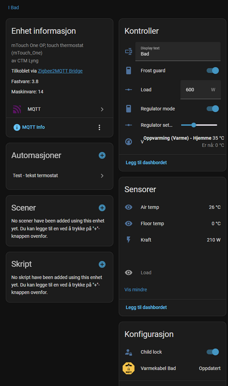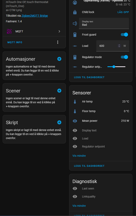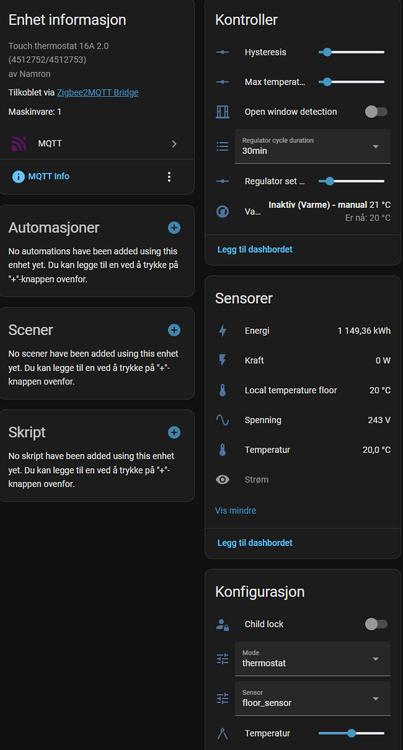 15. Jeg har en på badet, kjører den i regulator modus da jeg ikke har gulvføler, den var lett å få inn i Zigbee2MQTT.