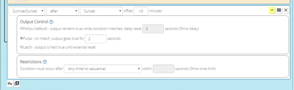 Trykker du på pila på siden av "sunset" linja så kan du velge "Pulse" under output control. Da skal du kunne sette hvor lenge "sunset" variabelen er aktiv tror jeg? Det ser sånn ut: