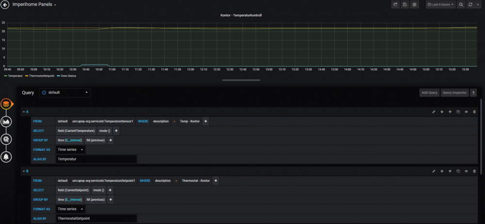 Hvordan gjør du dette? bruker du adminpanelet på port 3000? Jeg er ganske fersk på grafana selv, men query's fikk jeg satt opp ganske raskt via GUI, og grafen brukes i imperihome paneler.. Når jeg fikk InfluxDB opp så kom den inn som autocompletevalg i graf querys.. Fint system!