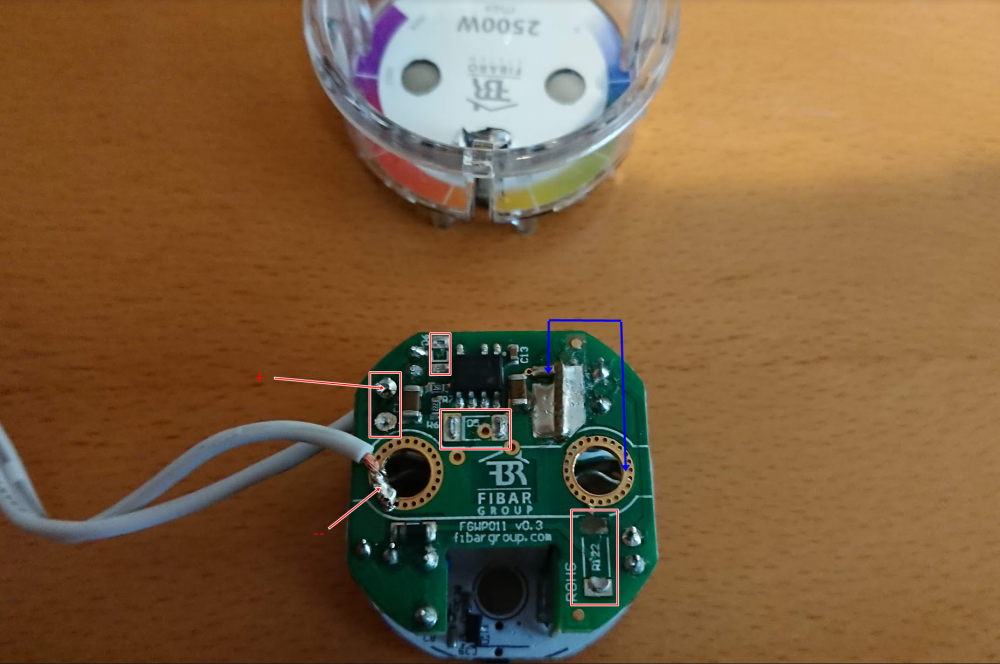 Versjon 1 av Fibaro Wall Plug hadde litt problemer med å leve med 220VAC, og ble byttet ut med versjon 2. Om du fortsatt har slike liggende er det forholdsvis enkelt å bygge den om til et 12V Z-wave relè: Lodd av 4 komponenter rundt AC/DC kretsen og sett inn 12V på anviste plasser, og vips. Relèet bryter da den andre siden som ikke er loddet på, og det funker nok fint å enten sette 12V+ fra samme kilde der siden denne er isolert fra resten av kretsene. Eller bare bruke den som en enkel relèkontakt. Edit: Koble sammen punktene de blå pilene peker på, så setter man ut 12V fra samme strømforsyning. Denne kan jo settes på innsiden av enkelte LED lampedrivere f.eks? Gjenbruk er jo i vinden om dagen.. ?