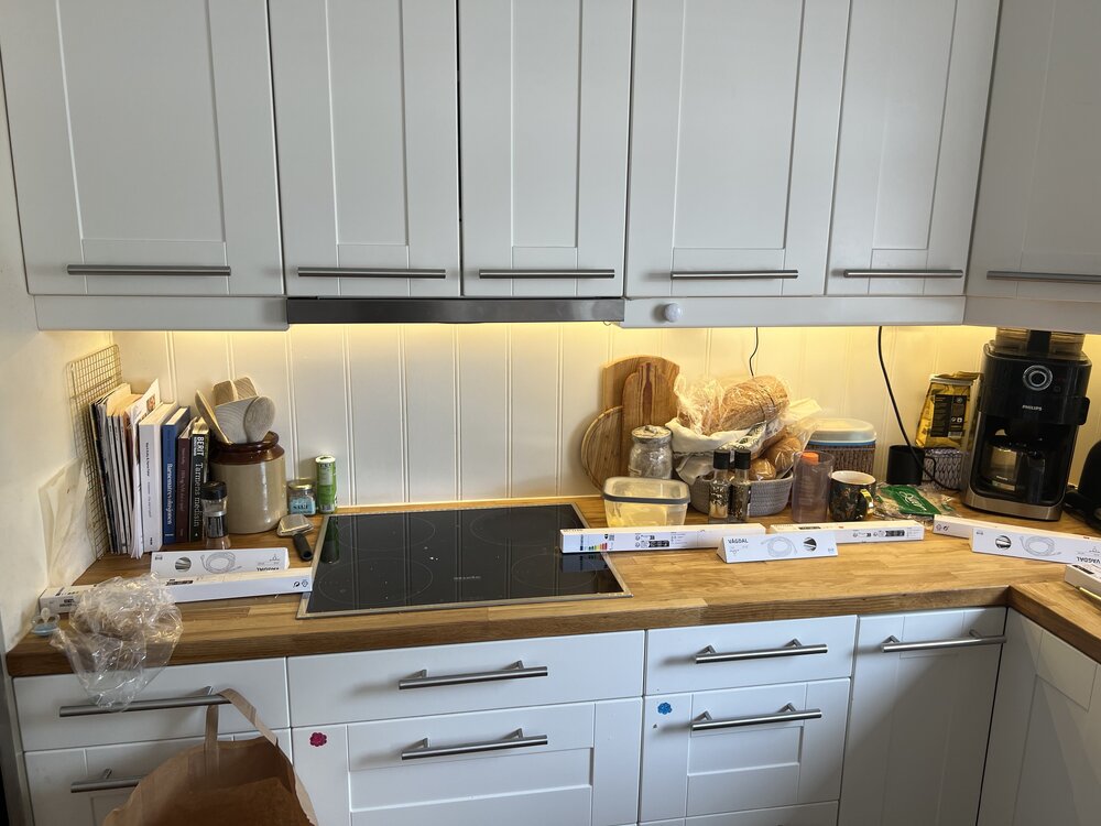 Etter 6,5 år har disse fungert helt feilfritt - har ikke rengjort dem heller. 😉😛 ... men nå har jeg "oppgradert" til "IKEA Mittled" i stedet. Altså fra: til: Hadde glemt at jeg hadde lagt den gamle bak kjøkkenventilatoren, så mulig jeg må installere en ekstra 60 cm Mittled der. Men er litt redd "lysbildet" blir veldig annerledes enn resten, siden den kommer helt inntil veggen... Eneste negative med Mittled er at jeg måtte ha 5 stk 3,5 meter kabler ("Vågdal"), da det kun er mulig å koble lysene sammen direkte i hverandre og alle andre lys må kables til LED-driveren. Dvs at det er egne kabler fra lysene: * Til venstre for platetoppen * Til høyre for platetoppen * Til lyset under hjørneskapet * Til høyre for kaffetrakteren * Til høyre for vinduet (som ikke vises på bildet) 3 av disse er mellom 10-60 cm fra driveren, men er altså koblet til med 3,5 meter kabel hver! Kunne selvsagt klippet og skjøtet, men gadd ikke det. At IKEA ikke har en 5-10 cm skjøt som kan brukes mellom lys (f.eks under hjørneskap) er helt utrolig...! 😞 Se også denne, for mer info om Mittled: