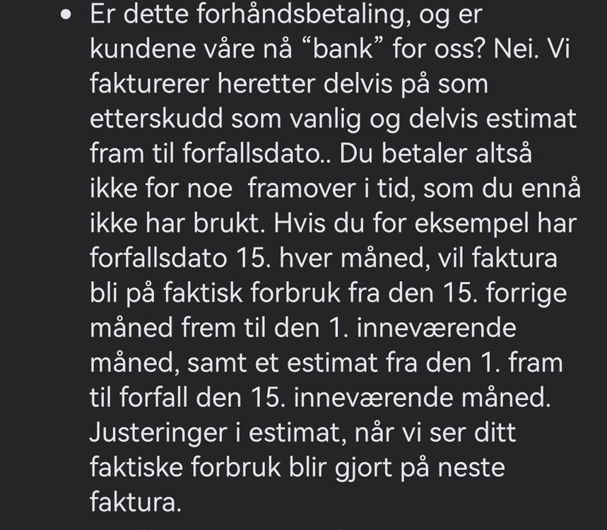 Det er vel kun denne regningen du betaler på forskudd. Neste regning er vel at de sender ut regningen den 15. Med betalingsfrist den 30. Der de har stipulert hva du vil bruke mellom 15. og 30. Neste regning der igjen så trekker de fra eller legger til alt ettersom de har truffet på stipuleringen. Eller misforstår jeg helt?