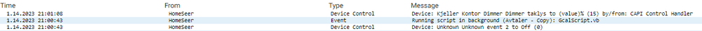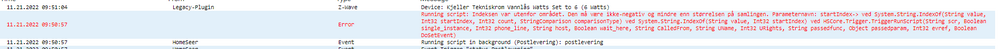 Hei. Hva er det jeg gjør galt mon tro? Windows 10. Homeseer 4. Kopierte scriptet og forandret på dev id og postnr. La til ScriptingReferences i settings.ini. Den lå ikke der fra før. Restartet HS4. ScriptingReferences=System.Core;System.Core.dll,Newtonsoft.Json;C:\Program Files (x86)\HomeSeer HS4\Bin\homeseer\Newtonsoft.Json.dll Running script: Indeksen var utenfor området. Den må være ikke-negativ og mindre enn størrelsen på samlingen. Parameternavn: startIndex-> ved System.String.IndexOf(String value, Int32 startIndex, Int32 count, StringComparison comparisonType) ved System.String.IndexOf(String value, Int32 startIndex) ved HSCore.Trigger.TriggerRunScript(String scr, Boolean single_instance, Int32 phone_line, String host, Boolean wait_here, String CalledFrom, String UName, Int32 URights, String passedfunc, Object passedparam, Int32 evref, Boolean DoSetEvent) "Sub Main(ByVal params As Object) Dim devRef As Integer = 3181 Dim postnummer As Integer = 7300"
