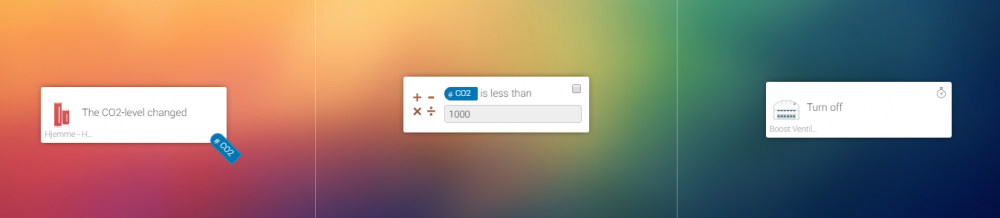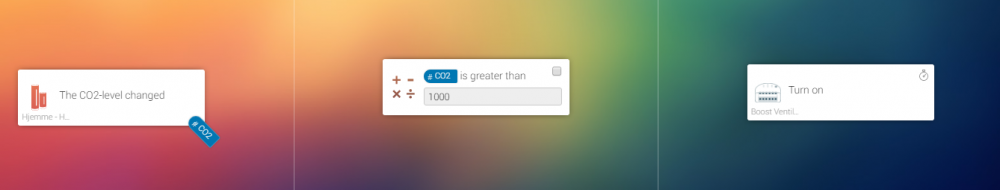 Har nå en drøss med Fibaro enheter for å styre lys, varmtvannstank med radiator og 2 varmeelement, Ikea trådfri både inne og til noe utelys. Netatmo, Flexit roomie ventilasjonsvifte-system. Der kjører jeg en Fibaro single switch 2 for å sende viften ett boost signal når Netatmo gir beskjed om for høy CO2 (står til 1000 PPM som test for øyeblikket) samt at Homey gir en høyttalende beskjed om at CO2 er høy og viften settes i boost modus. Har også 7stk Fibaro wall plug nå for å styre blandt annet: TV-utstyr, Vannkoker, Kaffetrakter, Pc'er, Mobilladere ved sengen. Har også en lekkasjesensor for å kunne få beskjed om varmtvannstanken tar kvelden (er fra 80'tallet...)