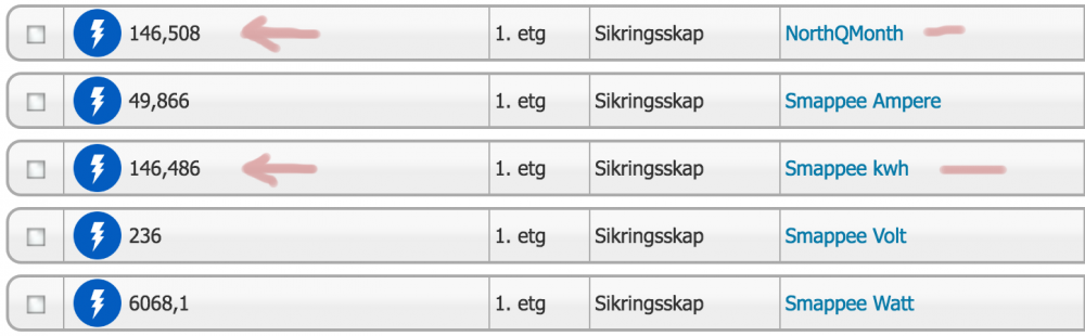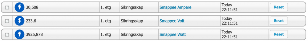 16. En liten modifikasjon til skriptet. Siden det kjøres hvert minutt så har jeg fått på plass en beregning av kWh. Denne beregningen legger til resultatet på en 4. device som da vil vise forbruket så langt i måneden. Denne blir så resatt til 0 ved månedsskiftet. Så også at jeg hadde noen 0-verdier i loggingen og fikk da på plass litt logikk som sørger for at den ikke skriver 0-verdier i databasen if (volt > 0) hs.SetDeviceValueByRef(839, volt, true); if (ampere > 0) hs.SetDeviceValueByRef(840, ampere, true); if (watt > 0) hs.SetDeviceValueByRef(841, watt, true); var kWh_Previous = hs.DeviceValueEx(842); var Session_kWh = (0.0166667 *watt)/1000; var kWh = kWh_Previous + Session_kWh; if (kWh > 0) hs.SetDeviceValueByRef(842, kWh, true); Som dere ser så stemmer beregningen veldig bra med NorthQ sin faktiske kWh-avlesning