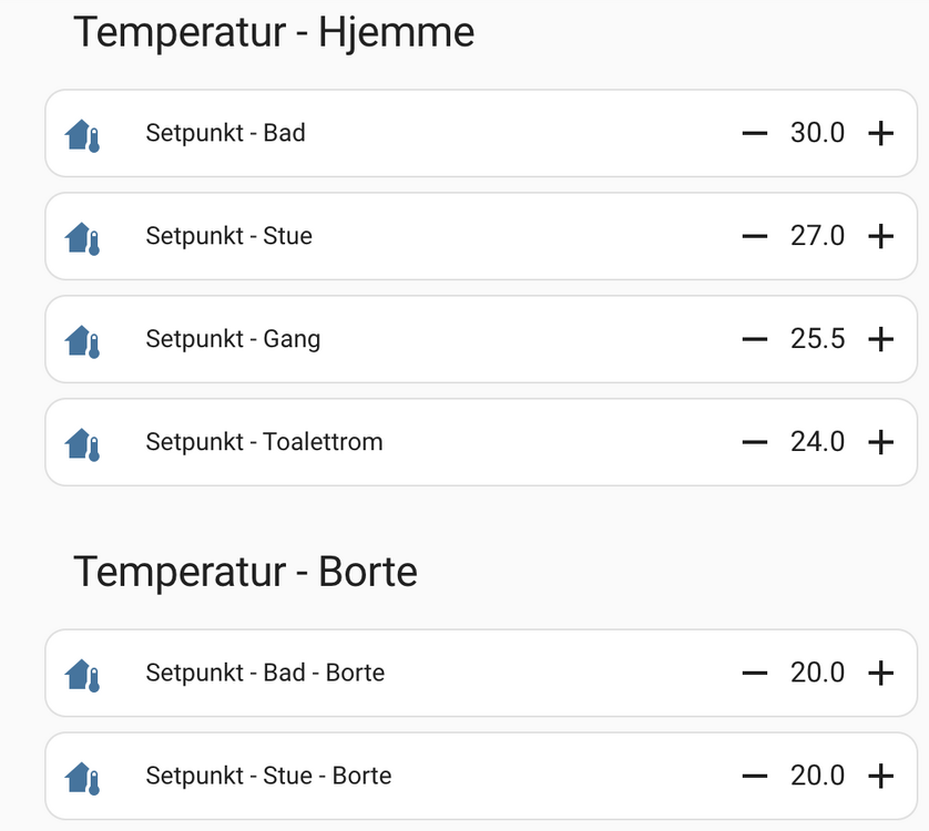 Hva som er best-practice og ikke er en sak, men jeg har HeatIt termostater og har valgt å løse det på følgende måte. Jeg har to sett med input_number helpere som jeg vedlikeholder manuelt. Når hytta går i "dvale" så endrer jeg fra det ene settet til det andre via automasjoner. På denne denne måten kan man i det minste vedlikeholde tempraturene utenfor selve automasjonene.