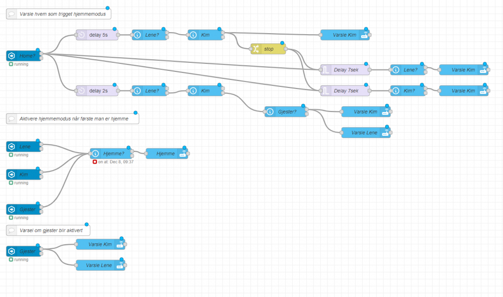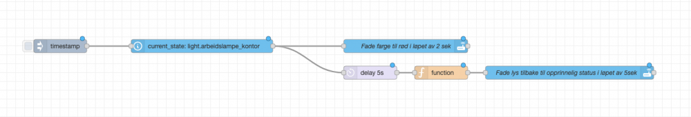 Her kommer et eksempel på varsling ved bruk av en fargepære. Denne leser status på farge og lysstyrken på pæren, deretter fader den til rød med 99% lysstyrke i løpet av 2sek, deretter venter den 5sek før den fader tilbake til opprinnelig status. Varslingsfarge redigeres i node (Fade farge til rød i løpet av 2 sek) Rød - {"brightness_pct": 99,"rgb_color":[255,0,0],"transition":2} Grønn - {"brightness_pct": 99,"rgb_color":[0,255,0],"transition":2} Blå - {"brightness_pct": 99,"rgb_color":[0,0,255],"transition":2} Lysstyrke: endre verdi etter brightness_pct fra 1-99 Overgang: endre tall i sek etter transition Send PM om du ønsker kopi av flow.