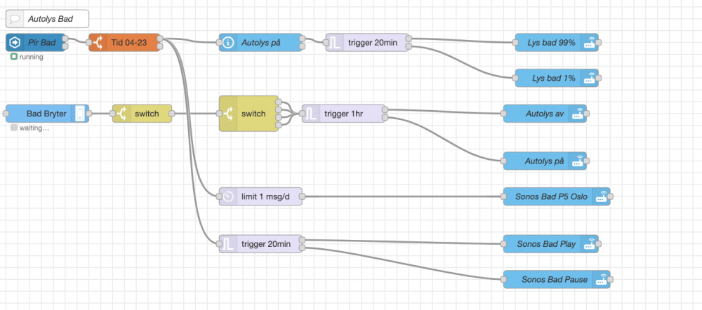 Lys og radio ved bevegelse Denne setter lys til 99% ved bevegelse, og ned til 1% 20min etter siste bevegelse. Den starter Sonos ved bevegelse og setter pause etter 20 min. Ved dagens første bevegelse angir den radiostasjon. Dersom noen bruker bryter deaktiveres lys automatikk i 1time Send PM om du ønsker kopi av flow.