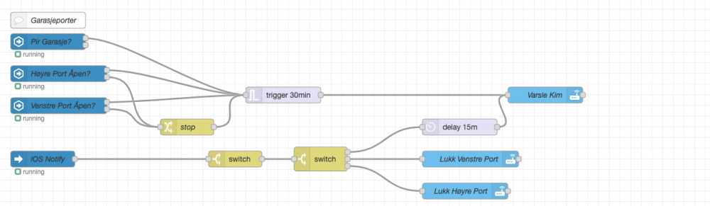 Pushvarsel på garasjeporter dersom en eller begge har vært åpne og ingen bevegelse i garasjen på 30min. Denne har og handlingsknapper i push melding, der man velge hvilken port man ønsker og lukke eller slumre i 15min. Send PM om du ønsker kopi av flow.