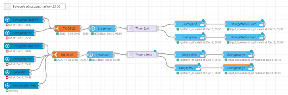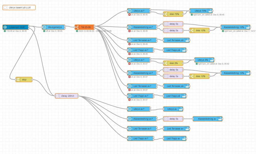 Flow for styring av utelamper. Utelamper styres av LUX veridier fra Philips Hue Motion sensor. Dersom klokken er imellom 6-23 vil utelamper slå seg på med 75% lysstyrke, dersom kl er mellom 23-6 vil de slå seg på med 5% lysstyrke. Utelamper settes til 5% kl 23 og settes til 75% kl 06 dersom solen ikke er oppe. Utelamper slår seg av dersom LUX verdien overstiger satt nivå i 20min. Bevegelse mellom kl 23-06 gir 99% lysstyrke på Utelamper i 15min og Flomlys aktiveres i 3min Send PM om du ønsker kopi av flow.