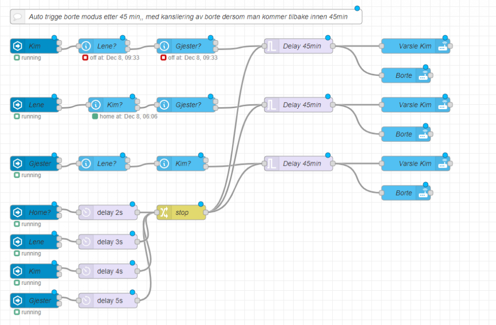 Flow for å aktivere hjemme og borte modus via automatikk. Denne har også en delay på bortemodus dersom man kun skal en rask tur i butikken osv. Varsling av hvem som trigger hjemme/bortemodus til mobil Send PM om du ønsker kopi av flow.
