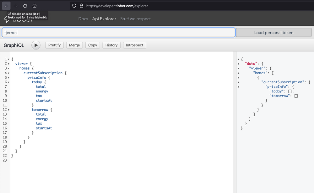 APIet "virker", men det kommer er tomt svar. - altså prisene mangler. Jeg la inn alternativ uthenting av prisene fra https://www.hvakosterstrommen.no/strompris-api hos meg - greit å ha to kilder. Da er egentlig vitsen med å bruke Tibber litt borte for min del... -