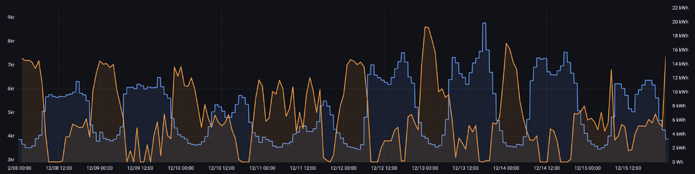 Kan rapportere at jeg ligger an til å ha spart rund 6000 NOK i desember på strømregningen ved å kjøpe strømmen når den er billig og bruke batteriene når den er dyrt. Legger ved en graf som viser strømprisen (blå linje) vs forbruket (oransje linje). Når man ta med strømstøtten i regnestykke, så er jo den "nattstrømmen" i praksis gratis. -