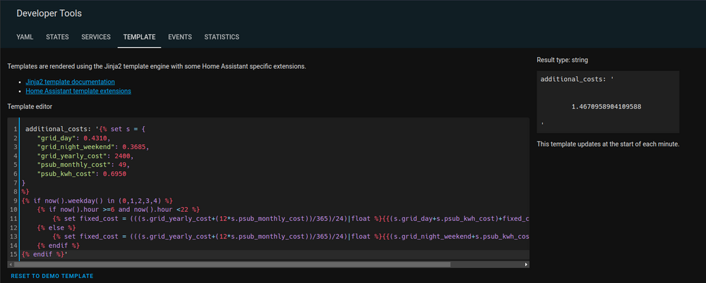 1. Jeg løste det med å samle følgende i en linje: {% if now().weekday() in (0,1,2,3,4) %} {% if now().hour >=6 and now().hour <22 %} additional_costs: '{% set s = { "grid_day": 0.4310, "grid_night_weekend": 0.3685, "grid_yearly_cost": 2400, "psub_monthly_cost": 49, "psub_kwh_cost": 0.0695 } %} {% if now().weekday() in (0,1,2,3,4) and now().hour >=6 and now().hour <22 %} {% set fixed_cost = (((s.grid_yearly_cost+(12*s.psub_monthly_cost))/365)/24)|float %}{{(s.grid_day+s.psub_kwh_cost)+fixed_cost|float }} {% else %} {% set fixed_cost = (((s.grid_yearly_cost+(12*s.psub_monthly_cost))/365)/24)|float %}{{(s.grid_night_weekend+s.psub_kwh_cost)+fixed_cost|float }} {% endif %}'