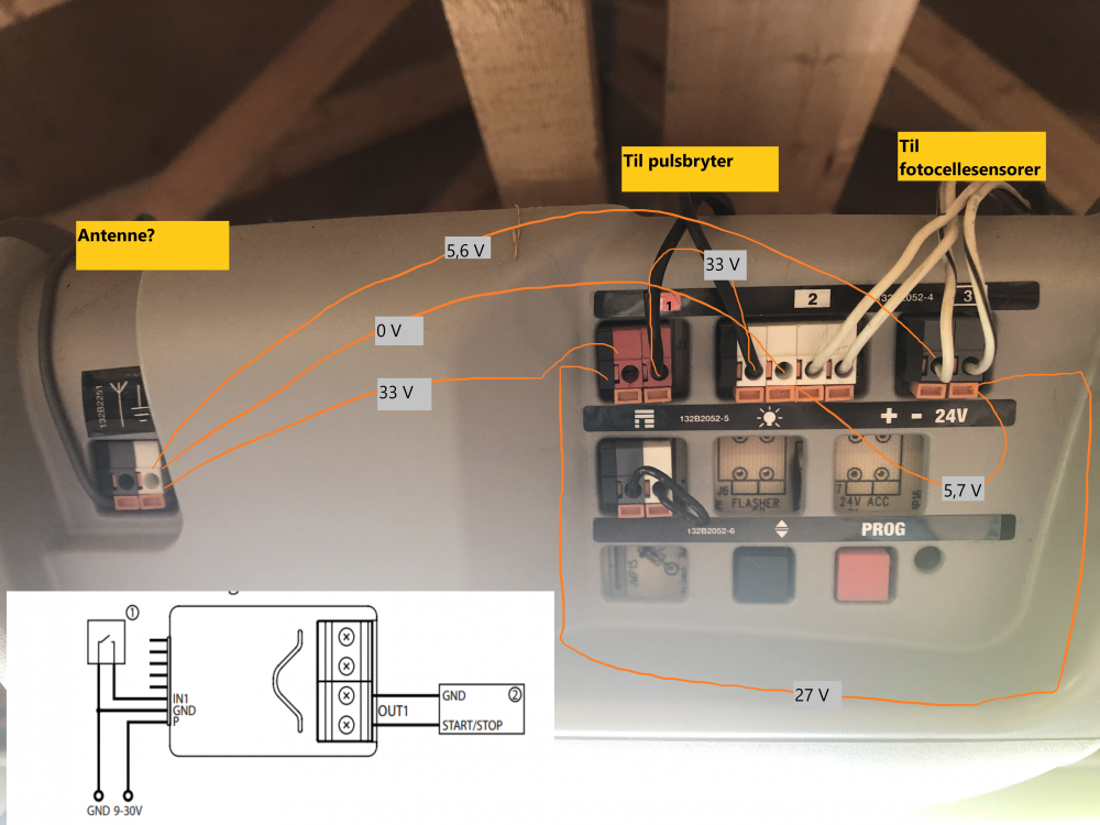 Hei, jeg ønsker å koble Fibaro Smart Implant inn så jeg både kan åpne garasjen gjennom z-wave nettverket mitt men fortsatt bruke den eksisterende impulsbryteren. Var vanskelig å finne noe dokumentasjon på nettet for denne åpneren, fant ikke noe som var helt likt. Jeg har dratt ut ledningene og målt spenningen mellom flere punkter i de orange strekene på tegningen, men det er vanskelig å vite helt sikkert hva som er strøm og hva som er inngang for portåpneren. Noen ideer til hvordan jeg kan koble dette? Dagens impulsbryter er koblet mellom koblingskontakt 1 og 2 på bildet, når disse kortsluttes så starter garasjeporten, men der måler jeg 33 V og det er kanskje litt for mye for Fibaro Smart Implant? Mens mellom koblingskontakt 3 og 1 er det mer anstendige 27 V. Jeg har også en trådløs fjernkontroll og har testet med denne, spenningen er konstant. -