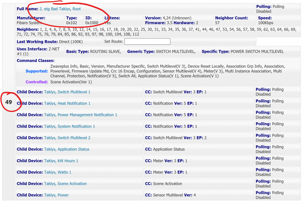 Mer Z-wave! Nå begynner det å bli hakket mer avansert. Vi retter et par små-feil, og vi setter opp litt assosiasjon. HomeSeer og Z-wave Øverst til høyre på "Device Management"-siden finner du en blå knapp med et antenne-symbol på. Det er Polling. Trykker du på den vil HomeSeer spørre nodene du ser om hvilken status de har. Hvis du kikker litt nærmere på en Fibaro Dimmer 2 node, vil du se at et par ekstra enheter som ikke gir fornuftig informasjon, samt en ekstra "dimmer" (som gjør at status ikke blir oppdatert hvis du trykker på en fysisk knapp). Jaha, men hvorfor fikk vi de? Problemet er egentlig ikke HomeSeer. Det er hvordan Fibaro har valgt å skrive firmwaren sin. Noen gateway'er og programmer har et grunnleggende Z-wave-oppsett i bunn, men legger til støtte enhet for enhet. Problemet med en slik tilnærming er at det krever mye energi, man får et begrenset utvalgt enheter, og en gammel enhet med ny firmware må testes på nytt fordi oppdateringer kan fikse en ting men ødelegge for noe annet. HST går istedenfor bredt ut. HomeSeer sin "policy" er at hvis en enhet er sertifisert ihht. Z-wave (Plus) så skal den være støttet i HomeSeer. Men støtten er dermed avhengig av produsenten. Hvis de har gjort alt riktig uten å gjøre noen "smarte tilpasninger" (for eksempel for å kunne bli integrert "bedre" i sin egen gateway enn andre) så går det glatt inn i HomeSeer. Fibaro lager god hardware, men firmwaren er (etter min mening) ikke like god. Men Fibaro er langt fra de eneste som har dette problemet. Feilretting Først retter vi på assosiasjoner slik at HomeSeer og dimmeren snakker sammen. For å konfigurere en node, må vi finne "root". I de fleste tilfeller finner vi root'en øverst i node-gruppa, med tannhjul-symbolet og teksten "No Status" (root har normalt ingen status). Trykk på "Fibaro Switch Multilevel", og gå til tab'en "Z-wave". Du ser noe slikt: Trykk på den gule pilen foran "Associations". Hos meg ser det da slik ut: MERK: Det korrekte pr. april 2020 er at Group 1 skal være assosiert til HS med Endpoint 1 for en Fibaro Dimmer 2. Group 2, 3, 4 og 5 skal ikke være assosiert til HomeSeer (men kan være assosiert til andre lys hvis du ønsker det, selvfølgelig), Det skjulte under var gjeldende praksis da guiden ble skrevet. EDIT: Du trenger muligens ikke slette disse devicene lenger, de kan faktisk gi nyttig informasjon. Det er avhengig av hvilken firmware du har på Dimmeren, og hvilken versjon av Z-wave plugin'en du kjører. Det vil klare seg med å bare skjule (velg "Hide") dem istedenfor å slette dem. Så sletter vi "devicer" ikke gir mening. Du kan slette "Heat Notification", "Power Management Notification", "System Notification" og "Switch Multilevel 2". Det gjør vi enklest ved å velge dem med avkryssingsboksene til venstre, og velger "Delete" i nedtrekksmenyen øverst til venstre. Sånn! Nesten ferdig! Hos meg manglet "Switch Multilevel 1" (av for meg uforståelige grunner) kommandoen "On Last Level". "On" betyr "dim til 100%", mens "On Last Level" betyr "dim til det nivået dimmeren var satt til sist", og er dermed ganske hendig. Hvis denne ikke dukker opp hos deg, er det heldigvis enkelt å legge til. Trykk på den blå linken til "Switch Multilevel 1" og gå til tab'en "Status Graphics". Denne vil sannsynligvis se slik ut: Vi skal legge til en entalls verdi/kommando og trykker på knappen "Add Single Value". Value settes til "255", status tekst endres fra "Change me" til "On Last Level", og i nedtrekksmenyen under velger du "On Alternate". Row settes til "1" og Column til "3". Så blar vi helt nederst til siden og trykker "Done". For sikkerhets skyld trykker vi på "Switch Multilevel 1", går til "Status Graphics"-tab'en og verifiserer at verdiene ser slik ut. (Dette har aldri vært et problem med PC-versjonen, men Zee2 tullet litt med dette før versjon .270. Burde være fikset nå, men vi sjekker likevel). Nå er alt vel! Når du har gjort dette et par ganger, vil det gå raskt etterpå. Det tar ca. 30 sekunder (avhengig hvor lang tid assosiasjonene tar). ... og det er bare å fortsette å inkludere noder. Under er en eldre Qubino dimmer inkludert. Parametere En node har sannsynligvis flere innstillinger enn de som er tilgjengelige via et brukergrensesnitt. Dette er typisk for verdier som ikke behøves å justere så ofte. Eksempler er temperatur-kalibrering, følsomhet for en bevegelsessensor, hvor lang tid en dimmer bruker på dimmer opp/ned lyset, og så videre. Slike ting justeres vanligvis med en parameter. En parameter består et parameter-nummer (et heltall mellom 0 og 255), samt en verdi (1 byte, 2 eller 4 bytes). Men det er ingen fastsatte regler om hva de forskjellige parameter-nummerne er, så det må vi slå opp i manualen. Det er også viktig å bruke manualen som fulgte med i boksen til produktet du kjøpte, for andre firmware-versjoner kan faktisk ha andre parametere. Fibaro Dimmer 2 har en snedig funksjon som heter "auto calibrate". Den sjekker hvordan lyskilden som er koblet til oppfører seg ved forskjellige lysstyrker, og tar så hensyn til dette når dimmeren senere skal dimme lyset. Den starter automatisk når du kobler opp dimmeren første gang, men man kan også tvinge den i gang senere (og det er praktisk!) ved å sette sette parameter 13 til 1 (eller 2 hvis du bruker en Bypass). Igjen går vi til root, og videre til Z-wave. Vi trykker på den gule pilen foran "Settings", og fortsetter med å velge parameter 13, og sette verdien til 1. Slik: Så er det bare å trykke på "Set"-knappen, og autokalibreringsfunksjonen starter. Merk: Hvis du allerede har satt en parameter, men ikke husker hva du satte den til, kan du velge parameternummeret og la "Value" være blankt. Trykker du da på "Set" vil HomeSeer hente verdien du har satt. Hvis du ikke har satt en verdi, vil du sannsynligvis få teksten "ERROR". Da er det standardverdien som gjelder (så du må slå opp i manualen). Andre noder har et ferdig oppsett slik at du 