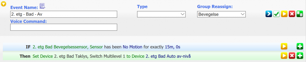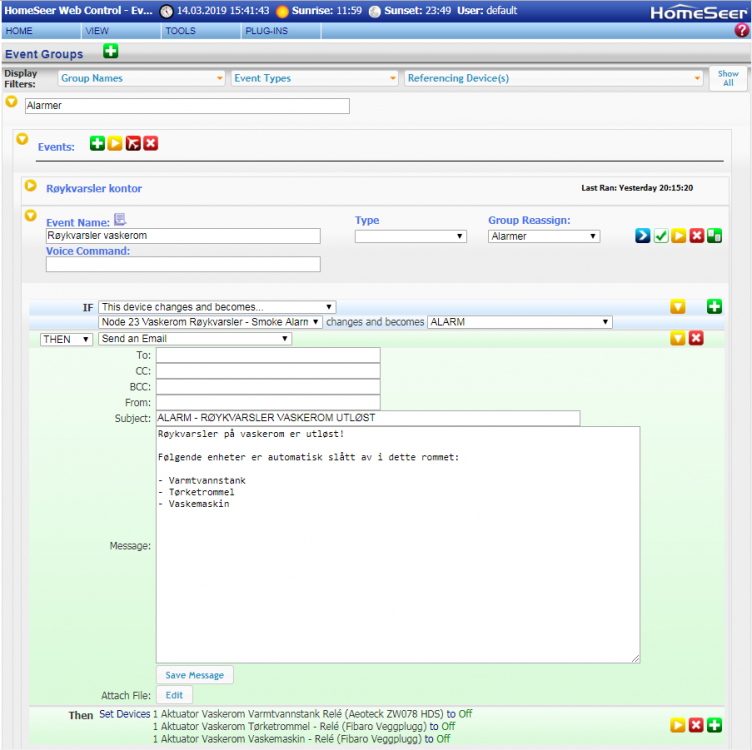 Beskrivelse: Hvordan legge til en Fibaro røykvarsler i HomeSeer. Dersom Fibaro Røykvarsler har vært tilkoblet et z-wave nettverk tidligere, må den først resettes før den kan legges til et nytt nettverk. I HomeSeer trykk på "PLUG-INS", "Z-Wave" og "Controller Management" Under "Z-Wave Interfaces" trykker du på , forran "Name: UZB1 z.wave transceiver" På rullegardin menyen "Actions:" velger du "Add/include a Node" Fibaro røykvarsler har en knapp på undersiden som registrerer om den er montert i en holder. Denne knappen (ved siden av batteriet) må holdes inne, under hele prosessen med å inkludere røykvarsleren i Homeseer. Det må være kortest mulig avstand mellom Fibaro røykvarsler og UZB1, monter UZB1 på en usb skjøteledning for å få disse så nært hverandre som mulig. Er avstanden for stor blir det problemer. Trykk på i Homeseer Trykk 3 ganger på knappen på toppen av Fibaro røykvarsler. Knappen på undersiden, som registrerer om Fibaro røykvarsler er montert i en holder, kan nå slippes. Trykk på "VIEW" og "Device Management" i Homeseer. Velg "Check all" på filtrene "Eiendom", "Rom" og "Device Type" I dette eksemplet er Fibaro røykvarsler lagt til som Node 24. Du skal se 12 nye devices i listen merket med "Node 24". Trykk på devicen "Fibaro Notification Sensor", med iconet av et tannhjul. Legg inn ønsket sensitivitet for røyk og device image Devicen "Application Status" kan skjules (ikke slettes), da den kun jobber i bakgrunnen. Devicen "Battery" rapporterer tilstanden til batteriet montert i røykvarsleren. Prosedyre ved bytte av batteri: Kan skjules (ikke slettes), brukes i direkte kommunikasjon med andre Z-Wave enheter (hovedkontroller og 3. tilknytningsgruppe "Alarm") Kan skjules (ikke slettes), brukes i direkte kommunikasjon med andre Z-Wave enheter (hovedkontroller og 3. tilknytningsgruppe "Alarm") Sender alarm dersom microbryteren under brannvarsleren registrerer at den er fjernet fra monteringsbranketten. (Må aktiveres manuelt) Kan skjules. Intern funksjon som reduserer strømforbruk i røykvarsleren? Kan skjules (ikke slettes), brukes i direkte kommunikasjon med andre Z-Wave enheter Varsler dersom det er tilstrekkelig mye røyk for å utløse røykvarsleren. Sender alarm dersom temperatur overstiger grenseverdi som er satt for temperatur alarm. (Må aktiveres manuelt) Rapporterer temperaturen fra temperatur sensoren i røykvarsleren. Eksempel på bruk av Fibaro røykvarsler i Homeseer: På et vaskerom er det ofte tørketrommel eller varmtvannstank som starter en brann. Har derfor hjemme hos meg satt opp en event som kutter strømmen til vaskemaskin, tørketrommel og varmtvannstank, dersom røykvarsler utløses. For hver røykvarsler jeg har montert, har jeg også testet dem etter oppsett. Video av testing av Fibaro røykvarsler. Har benyttet Splintax røykstikker for å teste.