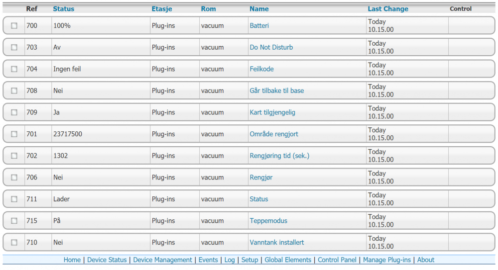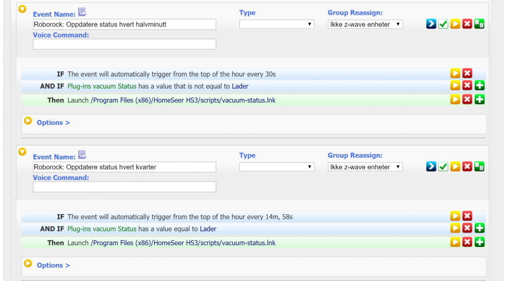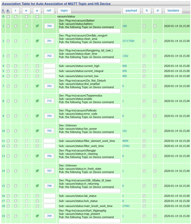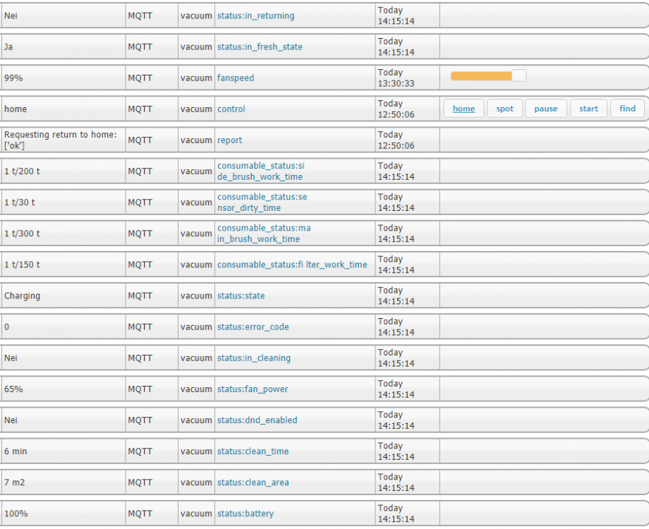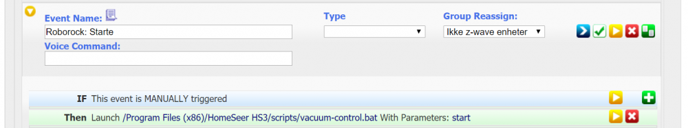 EDIT: Se egen guide for å få til det samme i Windows her: ————— Det finnes en tråd med litt diskusjon rundt det å få Xiaomi-støvsugere inn i HomeSeer her: https://www.hjemmeautomasjon.no/forums/topic/4080-xiaomi-mi-roborock-robotstøvsuger/ Resultatet i den tråden er at @Rogerbl har laget en integrasjon som han selger via sin nettbutikk. Når jeg kjøpte min første Roborock S5 denne uka så syntes jeg 800 kr var litt for mye for en programvare til en støvsuger jeg betalte 2400 kr for (no offence, @Rogerbl ). Så da måtte jeg ta saken i egne hender og ordne det selv. Jeg skal her forsøke å beskrive hvordan dette er gjort, forhåpentligvis godt nok til at flere kan kopiere løsningen. Jeg kjører Ubuntu, så om dette er mulig å få til på Windows har jeg ingen anelse om... Programvare som brukes: * En MQTT-broker (f.eks Moquitto) * mcsMQTT-plugin til HomeSeer * python-miio * mqtt-launcher Start med installasjon av python-miio: https://python-miio.readthedocs.io/en/latest/discovery.html Uthenting av token var veldig enkelt med Android, som beskrevet her: https://python-miio.readthedocs.io/en/latest/discovery.html#tokens-from-mi-home-logs Når du får "mirobo discover" fungerer så kan du gå videre. Hvis du ikke har en MQTT-broker, sett opp det og test at den fungerer, f.eks Mosquitto: https://mosquitto.org/download/ Installer og konfigurere mcsMQTT-plugin i HomeSeer og sjekk at den fungerer. Lag "/usr/local/HomeSeer/scripts/vacuum.sh": #!/bin/bash IP=192.168.1.10 TOKEN=1234567868767786345 mosquitto_pub -h localhost -t vacuum/status -m "$(miiocli -o json vacuum --ip $IP --token $TOKEN status)" mosquitto_pub -h localhost -t vacuum/consumable_status -m "$(miiocli -o json vacuum --ip $IP --token $TOKEN consumable_status)" mosquitto_pub -h localhost -t vacuum/status/carpet_mode -m "$(miiocli -o json vacuum --ip $IP --token $TOKEN carpet_mode)" Kjør den og sjekk at du finner disse i mcsMQTT. Hak av for "associate" på de samme enheten som jeg har over. Gå inn på enheten og gjør justeringer på prefix/suffix, osv etter eget ønske. Legg til vacuum/control i mcsMQTT, med dette oppsettet: Legg inn mqtt-launcher.py og .conf i /scripts-mappa: https://github.com/jpmens/mqtt-launcher Legg dette i mqtt-launcher.conf: logfile = 'logfile' mqtt_broker = 'localhost' # default: 'localhost'. If using TLS, this must be set to the domain name signed by your TLS certificate. mqtt_port = 1883 # default: 1883 mqtt_clientid = 'mqtt-launcher-1' mqtt_username = None mqtt_password = None mqtt_tls = None # default: No TLS topiclist = { # topic payload value program & arguments "vacuum/control" : { 'start' : [ '/usr/local/bin/mirobo', '--ip', '192.168.1.10', '--token', '2313213213221321231', 'start' ], 'find' : [ '/usr/local/bin/mirobo', '--ip', '192.168.1.10', '--token', '2313213213221321231', 'find' ], 'home' : [ '/usr/local/bin/mirobo', '--ip', '192.168.1.10', '--token', '2313213213221321231', 'home' ], 'spot' : [ '/usr/local/bin/mirobo', '--ip', '192.168.1.10', '--token', '2313213213221321231', 'spot' ], 'pause' : [ '/usr/local/bin/mirobo', '--ip', '192.168.1.10', '--token', '2313213213221321231', 'pause' ], }, "vacuum/control/fanspeed" : { None : [ '/usr/local/bin/mirobo', '--ip', '192.168.1.10', '--token', '2313213213221321231', 'set_fan_speed', '@!@' ], }, "vacuum/control/carpet_mode" : { None : [ '/usr/local/bin/miiocli', 'vacuum', '--ip', '192.168.1.10', '--token', '2313213213221321231', 'set_carpet_mode', '@!@' ], }, } (bytt ut "2313213213221321231" med token) Endre denne linjen i mqtt-launcher.py: https://github.com/jpmens/mqtt-launcher/blob/master/mqtt-launcher.py#L43 Legg inn CONFIG="/usr/local/HomeSeer/scripts/mqtt-launcher.conf" Kjør mqtt-launcher.py. Når du ser at det fungerer, legg den inn som en service, slik at den kjører automatisk, slik som beskrevet her: https://github.com/jpmens/mqtt-launcher/issues/20 Det var en "lyn-guide" på hvordan dette er satt opp. Kan utdype mer senere, ellers er det bare å spørre så skal jeg svare så godt jeg kan, selv om jeg verken kan noe særlig om MQTT eller Python...